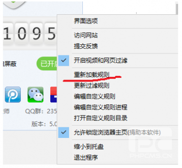 规则文件编译好后,请关闭文件编辑器,并再次在“ADBlock广告过滤大师”界面上右键点击出右键菜单,并点击“重新加载规则”: