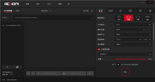 打开Mirillis Action!,可以看到有很多录制模式。一般来说,我们只要使用视频录制就行了。首先,切换捕获模式,如游戏、全屏、范围等,再调整好尺寸、帧率、音频,就可以开始录制。