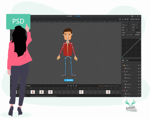 打破图形与2D角色动画的限制,添加骨骼到PSD分层图层,通过简单易用的骨骼动画工具和骨骼模板,轻松将图片(PNG和PSD格式)转变为2D动画角色,为视频、网页等提供更有趣的角色素材。