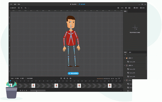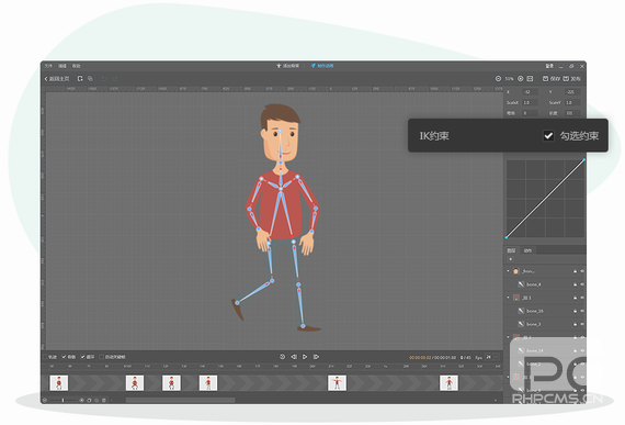 添加骨骼到图片后,可以控制骨骼让角色移动、任意角度旋转。其中曲线骨骼可以让角色的曲线变化更加圆滑流畅,从而让动画角色整体效果达到最佳。