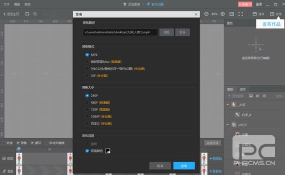 9、支持发布当前的内容,将骨骼动画编辑完毕就可以发布为MP4。