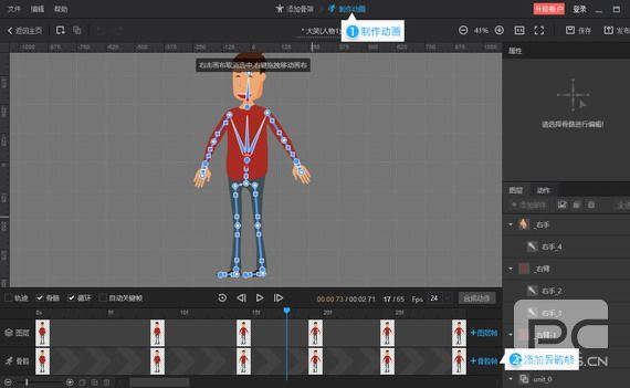 轻松导入多张图片,快速添加骨骼到图片中,利用骨骼控制多张图片的不同的姿势与动作,做出协调且丰富的角色动画。