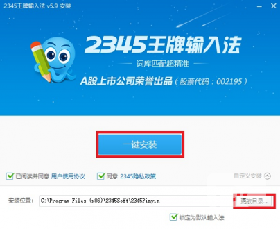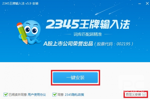 一、在本站下载最新版的2345王牌输入法安装包,双击运行,可以点击【一键安装】也可以点击【自定义安装】。