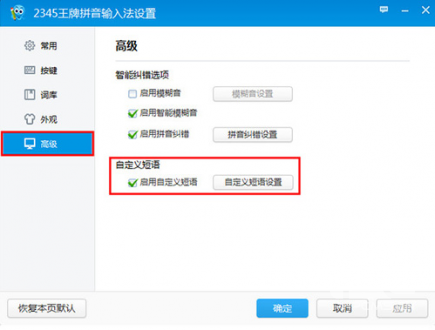 自定义短语功能”在右键菜单——设置——高级(如图所示)