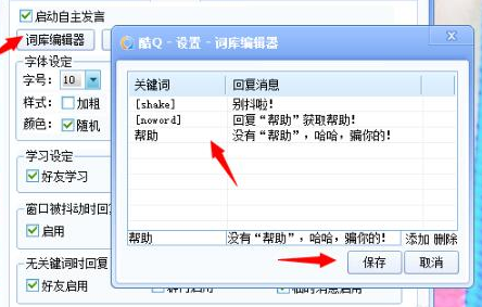 3、点击“聊天”选项卡界面的“字库编辑器”按钮,设置关键词自动回复,点击“保存”即可。
