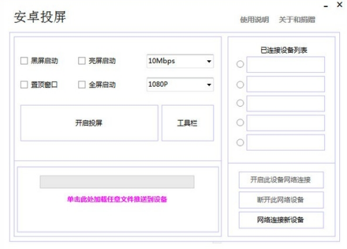 (2)使用前请确认你的设备已打开USB调试开关,电脑已安装安卓驱动,连接成功的设备将会直接显示在右侧列表中,使用时只需在主页面右侧列表中指定你需要投屏的设备,然后点击开启投屏按钮;