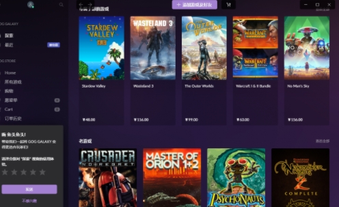 GOG平台官方版是一款很不错的pc游戏平台,万就可以在这款游戏平台中玩到各种各样的pc游戏,很多知名的热门游戏都是需要在这款游戏平台上进行下载游玩的,比如最近非常火爆的赛博朋克2077、巫师系列等等,当玩家想要玩一些国外游戏时就可以在这款游戏平台进行操作,在这款游戏平台上的所有游戏都是正版游戏,玩家不用担心自己购买到盗版游戏,并且游戏平台中的反外挂机制非常先进,为我们的玩家带来了更加健康的游戏环境。