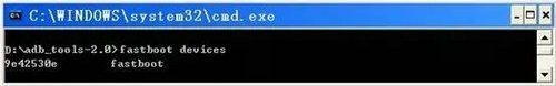 使用USB线连接手机和PC机,打开PC机的命令行窗口,进入ADB安装目录,确认手机与PC连接正常,确认方法为在命令行窗口输入fastboot devices,可以看到正常连接的信息,如:9e42530e fastboot。