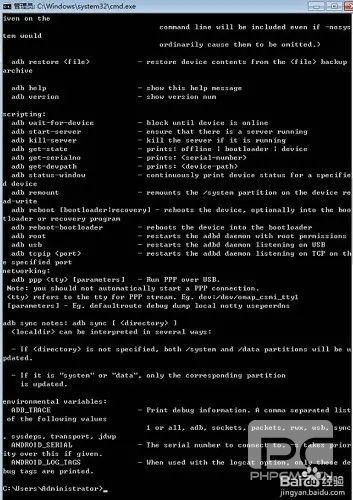6、关闭命令提示符窗口,并重新打开(也就是重复第一步),在命令提示符中输入adb,并回车,命令提示符中会打印出很多adb调试相关的帮助信息