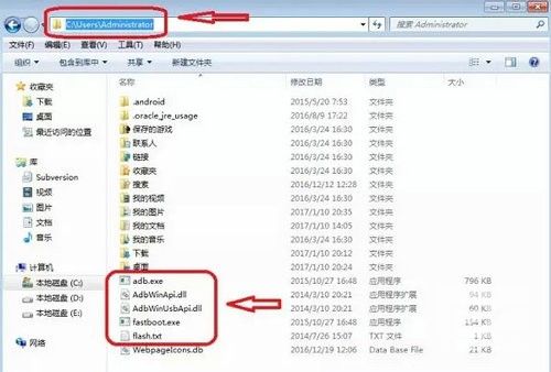 5、将adb工具拷贝到上述路径,如果你上一步显示的是C:UsersAdministrator,就把adb放在C盘->用户(User)->Administrator文件夹;如果你上一步显示的是C:Userszhangsan,就把adb放在C盘->用户(User)->zhangsan文件夹,