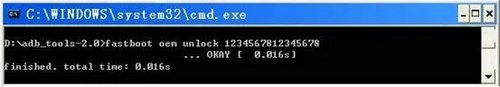 在PC机命令行窗口中输入fastboot oem unlock ****************,*号为16位解锁密码,例如:fastboot oem unlock 1234567812345678。