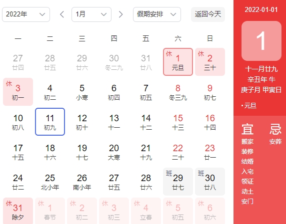 2021年12月31日(周五)-2022年1月2日(周日),共放假3天。