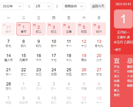 2022年1月31日(除夕、周一)-2022年2月6日(初六、周日),共放假7天,其中2022年1月29日(周六)、2022年1月30日(周日)正常上班调休。