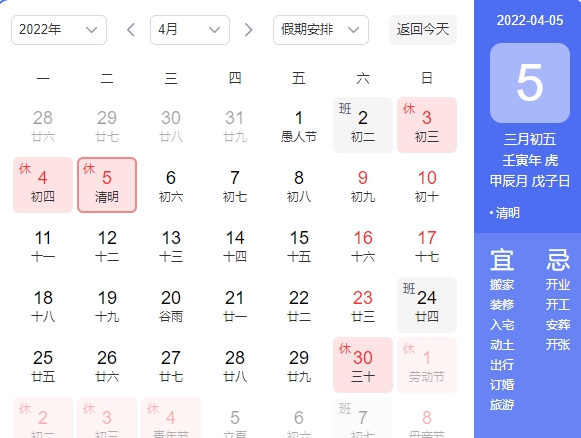 2022年4月3日(周日)-2022年4月5日(周二),共放假3天,其中2022年4月2日(周六)正常上班调休。