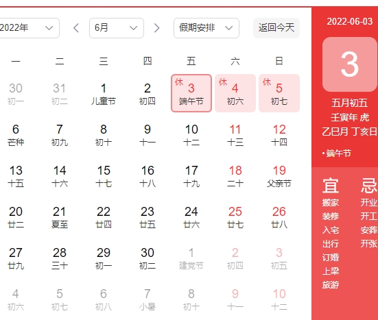 2022年6月3日(周五)-2022年6月5日(周日),共放假3天。