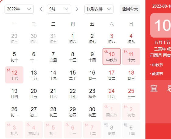 2022年9月9日(周五)-2022年9月11日(周日),共放假3天。