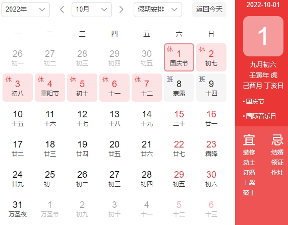 2022年10月1日(周六)-2022年10月7日(周五),共放假7天,其中2022年10月8日(周六)和2022年10月9日(周日)为正常上班调休时间。