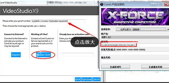 4、打开会声会影X9注册机,选择版本为会声会影X9,然后将序列号复制到注册界面,然后点击图中选项;