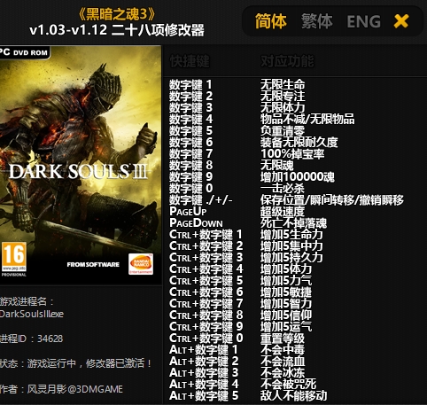 《黑暗之魂3修改器风灵月影版》是著名的修改神器,由“3DM风灵月影”原创制作的黑魂3的修改器,可以修改多达28个属性,大大提高了你的效率,免受游戏之苦啊。让各位玩家少受苦,多跑路!建议适度使用《黑暗之魂3修改器风灵月影版》,支持原创的难度,因为黑魂的难度是它非常重要的一环,任何东西都不能替代反复死亡,练习,配装,攻略后成功的喜悦感!