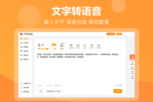 文字转语音助手破解版是一款文字转语音软件,它拥有优秀的语音专文字功能,可以帮助用户将文字转换为语音,其文字转换语音无数量限制。文字转语音助手破解版支持对语音的语速、音量进行设置,以便转换后的语音符合用户的使用需求。文字转语音助手破解版使用简单,只需将文字复制到软件中,选择播音人,点击播音,即可预览其文字转换为语音的效果,对转换效果满意后,点击生成,即可将转换的语音保存为mp3格式。
