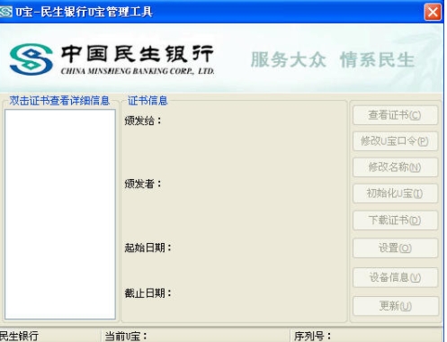 民生银行u宝管理工具是由于官方打造的网上银行辅助工具,能够让用户方便地进行证书的查看以及下载,可以通过它对u宝进行管理,你可以修改其名称、密码,进行初始化,使用方便。民生银行官方为u宝用户推出的u宝安全管理软件,能够让用户方便的修改u宝口令,名称以及证书管理,让你使用u宝更加的便捷。