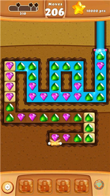 游戏中将水流往下层引流,或水流流过物品即可获得该物品,所以要消除阻挡水向下流的障碍。障碍的消除也是借助消除同种钻石来消除障碍。