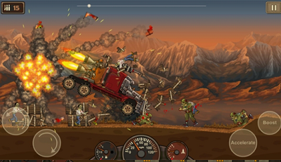 游戏的操作很简单,按下右边的加速按钮,汽车就启动了。玩家需要做的就是通过汽车左边的控制按钮控制汽车的平衡。玩家在游戏中的目的就是要越过重重的僵尸群,朝着下一个村落进发。所以请狠命的将车往僵尸们身上撞吧。游戏可不是一味的狂奔,车辆都有汽油的限制,一旦汽油消耗完了或者车辆完全停下来,挑战也就失败了。当然失败并没有关系,将挑战得来的钱拿去升级装备吧。升级之后又可以开始全新的一天的挑战。
