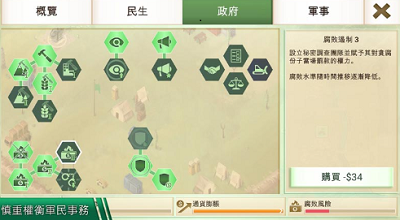 游戏经济树分为民生、政府和军事。这些科技点,均需要依靠金钱加点维持,投资民生,可以增加民众的支持度,但也会导致通货膨胀和腐败风险,通货膨胀只能靠时间自动下降,而腐败需要投资政府来遏制腐败。