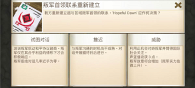 想要快速击败叛军势力,选择空袭,也可能会伤及无辜,导致平民怨气,另外军事行动也必不可少了金钱,如何平衡支出和收入也是玩家所要面临的一大难点。