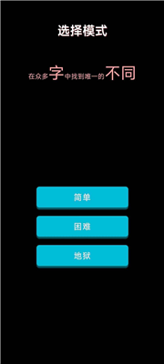 游戏分为三种模式“简单”、“困难”、“地狱”,不同模式对应不同难度,在相似字里面找到唯一不同。是一个有趣轻松,考察眼力的游戏,快来一起玩吧!