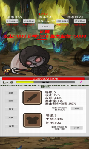 2、简单挂机玩线下收入模式,刷怪兽即可获取资源,使用金币或钻石即可强化装备技能。