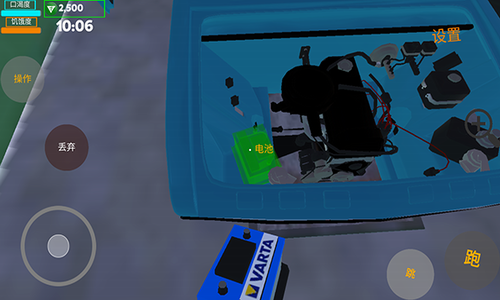 3、找到车库后,车辆是没有组装的状态,此时我们将零件一个个的安装进汽车里(对准物品点击左上角操作,将物品放置到汽车指定位置,点击操作安装),将所有物品安装好之后进入汽车。