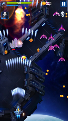 2、除主要宇宙飞船外,还有2名助手可以提高战斗力,使用激光导弹,巨型弹药和磁铁升级你的攻击强度,宇宙飞船速度。