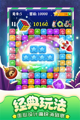 消灭星星消消乐下载最新版免费作为安卓手机上非常好玩有趣的安卓消除游戏,也可以叫做“消灭星星全新版”,其备受广大玩家们的喜爱与追捧,在这里你只需要一根手指轻轻一划,即可消除星星获得积分,时间越短所得的积分越高,但值得注意的是不能无脑乱点的,因为每一关都会要求达到一定的分数才能通关,这也无疑是让该游戏可玩性变得极强,适合各个年龄段的玩家进行畅玩,带你找到童年的乐趣所在。整体游戏画面设计很精致,以黑色为背景,搭配上了3D引擎打造的五颜六色的星星块非常的完美无瑕。游戏非常的解压,消除时都会有特效,点击到炸弹等道具消除更快还会带给玩家们更加轻松的感觉,快来试试吧!