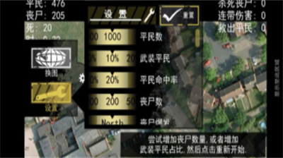 打开游戏右上角的设置按钮,参数中可以对平民和僵尸分别设置,平民的数量、平民武装的百分比、僵尸的数量、僵尸移动的速度和僵尸出现的位置等等一系列参数。