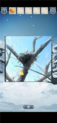 1、剧情ing 开局发现地上和树上都有黄色的东西,捡起来地上发现是果实(图片黄色区域),树上的就是我们需要的叶子,但是够不到,这时候点旁边蓝色区域的小房子,发现被雪盖住,要一层层的点掉