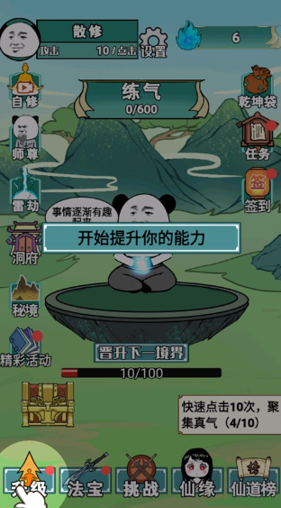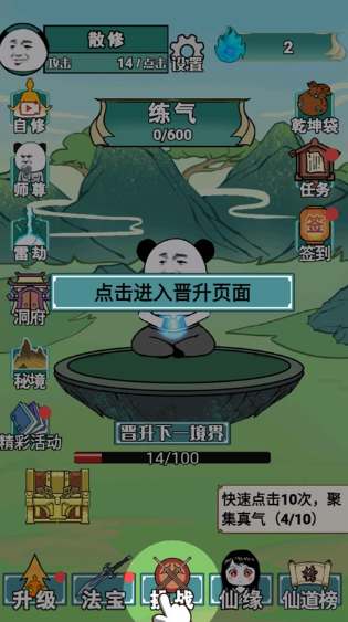 1、通过不断的点击屏幕,我们可以更快聚集真气,从而更好的晋升到下个境界。