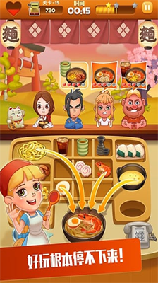 1、使用健康原料和美味食谱迎接面带笑容的顾客,在游戏中,你可以经营多家拉面店。