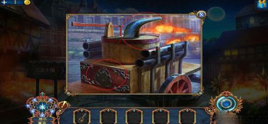 进入房子,右边壁炉捡起火的符号,用铲子铲灰,捡起框饰。左边地上,捡起火柴盒,小人。出门,在水车上用“火”打开柜子,得到