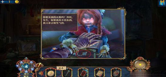进入火柴店,点右边的桌子,打开盒子,得到火柴店标志。