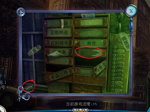 5、公寓大门,找到奇怪的锁部件2;一个个查看邮件箱,把门牌纸归们,直到找到斯夫人的邮件箱,使用紫光灯、指纹刷、指纹拓印得到指纹1。