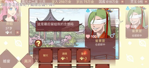 看上了心有所属的尚书,看上了已经订婚的侍郎,看上了如胶似漆的学士夫妇等等等,作为残酷的女帝,即使对面郎心似铁,你也可以通过任命职位,将一个留在羽都陪你,一个发配去地方(苍州etc)建设国家。几个月之后再看一眼心爱之人的履历,就会发现他因为和意中人聚少离多已经心灰意冷/签下和离书,赶紧收网吧。