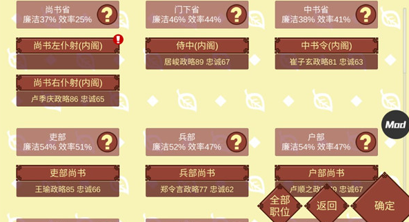 这也意味着如果盲目贬职忠诚度低的世家子弟,任命自己喜欢的角色/科举选出的布衣等可能会导致第一年因破产迅速暴毙(决堤/民变et),因此建议第一年先赏赐/讨好世家(提拔一些政略不那么高的世家子弟),苟过去再说界面默认显示是主管职位,可以点开下面一排中的‘’全部职位‘’进行任命/剥夺实权