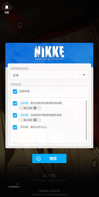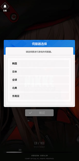1、下载并安装游戏后,首先需要我们选择国家地区(服务器选择在后方),勾选全部同意选项后,之后点击下方确认按钮