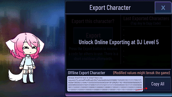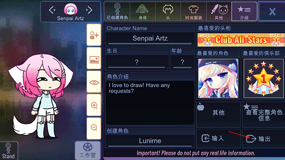 2、点开右下角的介绍,点击输出,复制人设代码,点击copyall复制即可,然后返回点击输入,输入人设代码。