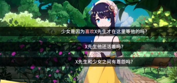 3、然后就是根据提示来选择,这些提问比如喜欢x先生才在这里等他答案是否,x先生他还活着吗,答案是否。X先生和少女之间有恩怨。答案,是。
