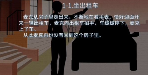 5、第一辑1.1坐出租车,麦克从房子里走出来,不断地在看手表,恰好迎面来一辆出租车,麦克向出租车招收,车缓缓停下来,麦克上了车,从此麦克从来没有回到这个房子里。
