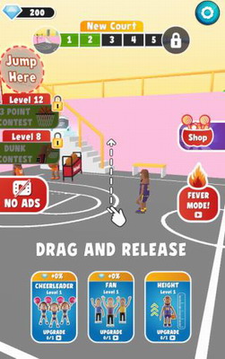 2、拖动角色起飞,瞄准篮筐,将篮球扔进篮筐并获得相应的分数。
