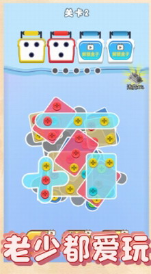 2、消除螺丝的玩法简单易懂,只需寻找并点击相同颜色的螺丝,然后将它们移动到对应的工具箱中。