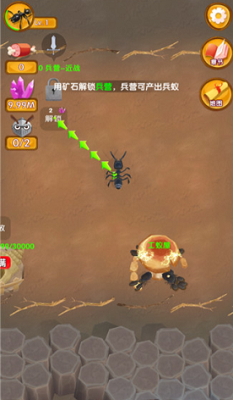 1、在本站下载安装好后,打开游戏,首先我们把蚂蚁拖动到【解锁】这两个字上,用矿石解锁兵营,兵营可以产出兵蚁;